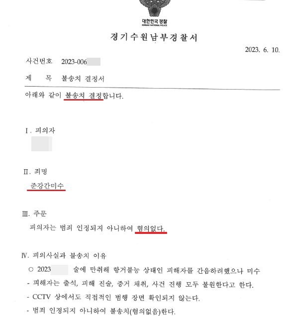 상대 여성은 제가 작성하여 제출한 변호인 의견서 내용에 대하여 반박하기 어렵다고 판단하여 더 이상의 절차 진행을 포기하였고, 경찰은 결국 최종 무혐의처분을 내렸습니다.