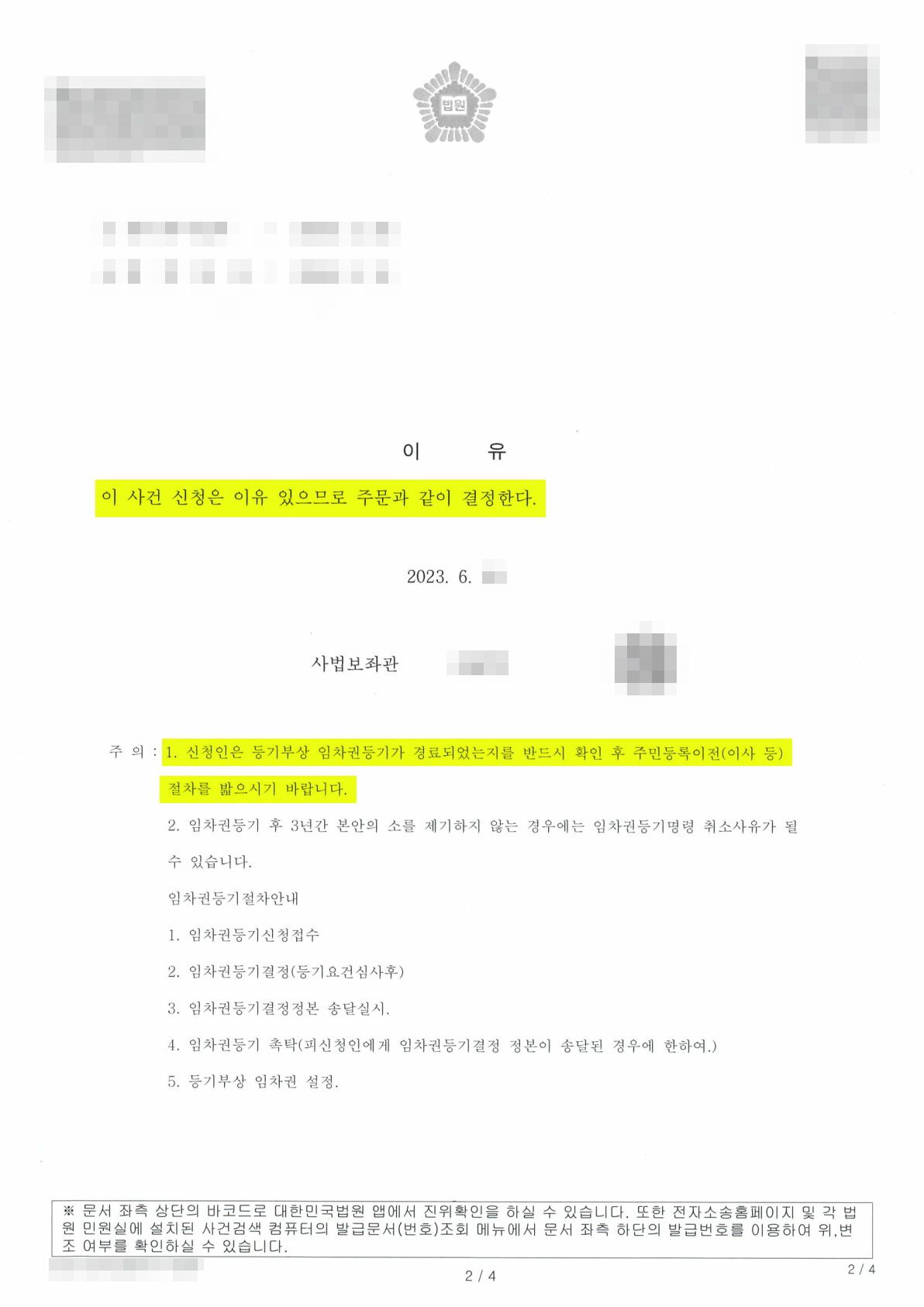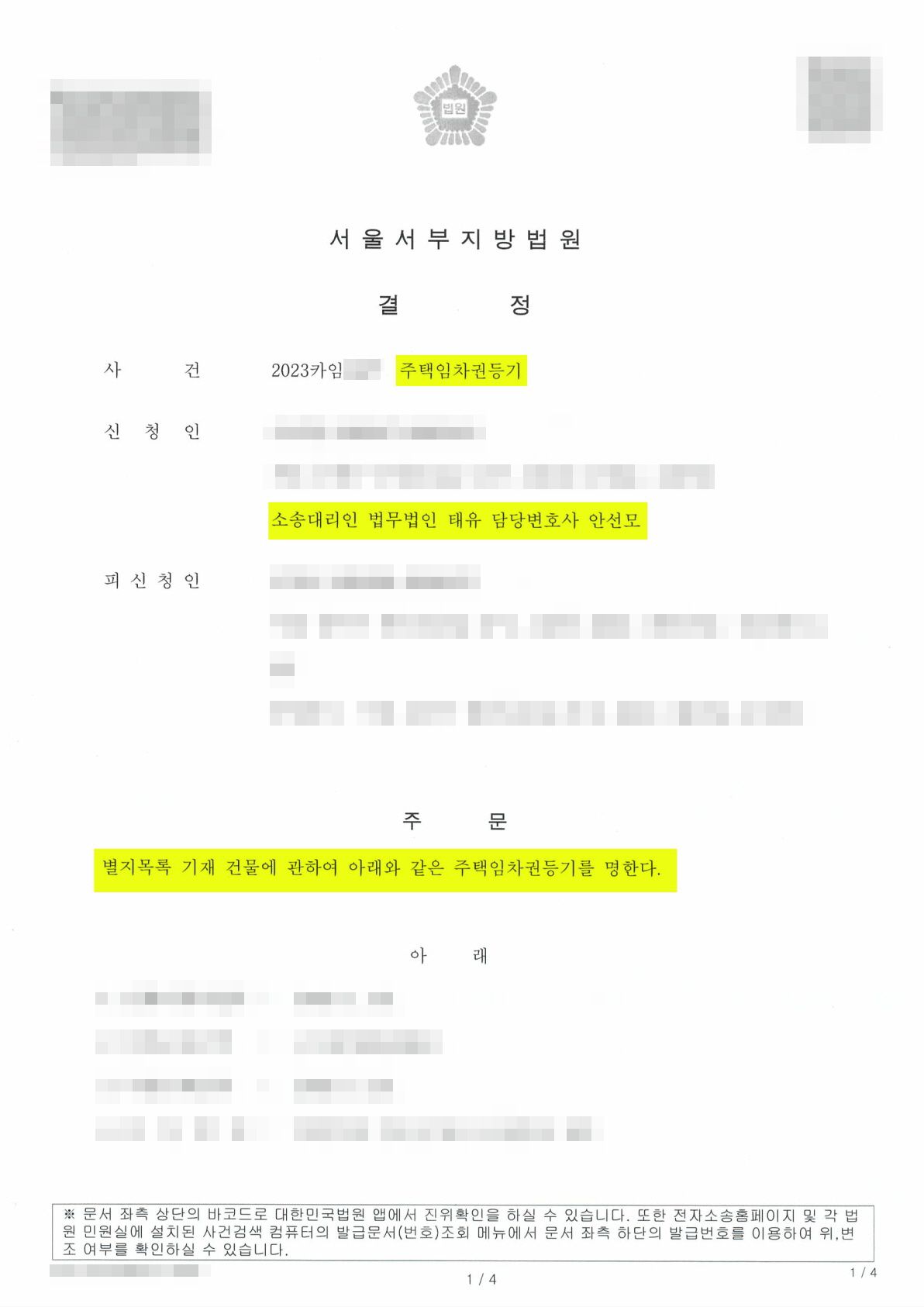 - 이 사건은 보통의 임차권등기 신청 사건들에 비해 결정이 다소 늦어 안변을 걱정시켰지만, 이는 단순히 법원의 업무량이 원인일 뿐 별다른 보정사항 없이, 바로 신청이 인용되어 현재 임차권등기명령 결정이 나온 상황입니다. 임차권 등기의 경우 상대방이 결정문을 수령하여야 등기소에 촉탁이 보내지므로 상대방이 임차권 등기 결정문을 수령하게 되면 임차권 등기가 진행될 예정입니다. 안변의 또한 상대방의 결정문 수령 여부를 계속하여 체크 중이며, 의뢰인께서 안전하게 이사하실 수 있도록 최종적으로 등기가 되는 것을 확인하여 의뢰인께 전달 드릴 예정입니다.