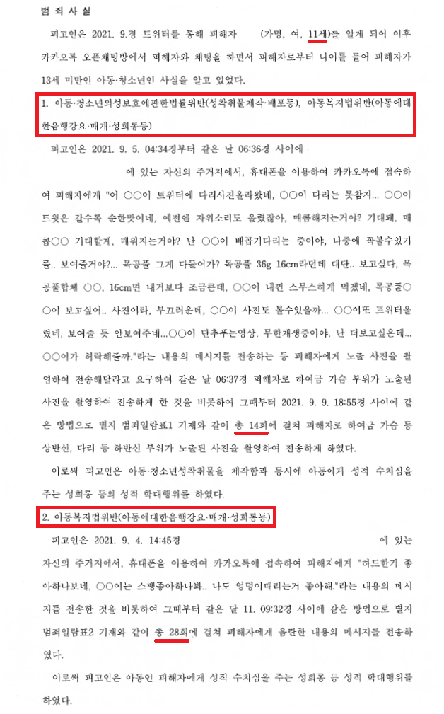 A씨는 트위터를 통해 알게 된 11세 초등학생 미성년자 B양과 카카오톡 오픈 채팅방에서 대화를 하면서 총 14회에 걸쳐 성착취물을 제작함과 동시에 성적 학대행위를 하고 총 28회에 걸쳐 성적 학대행위를 하였습니다.