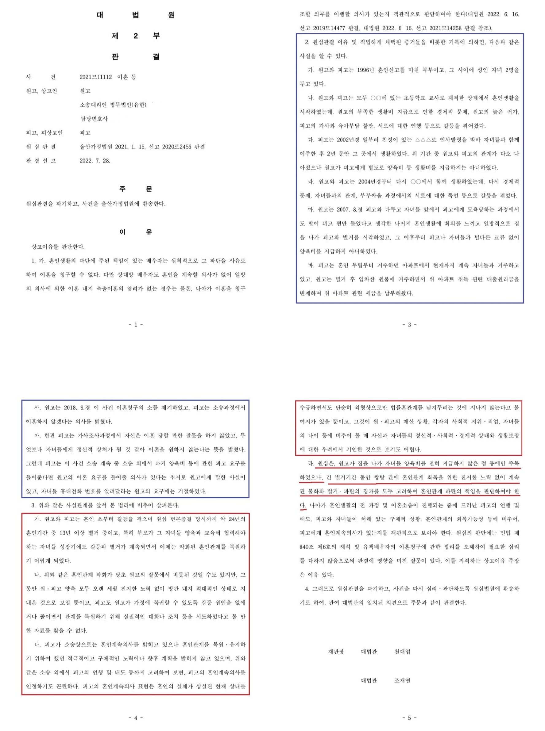 - 별거한 부부 일방이 제기한 이혼청구를 인용한 사건 : 대법원 2022. 6. 16. 선고 2021므14258 판결