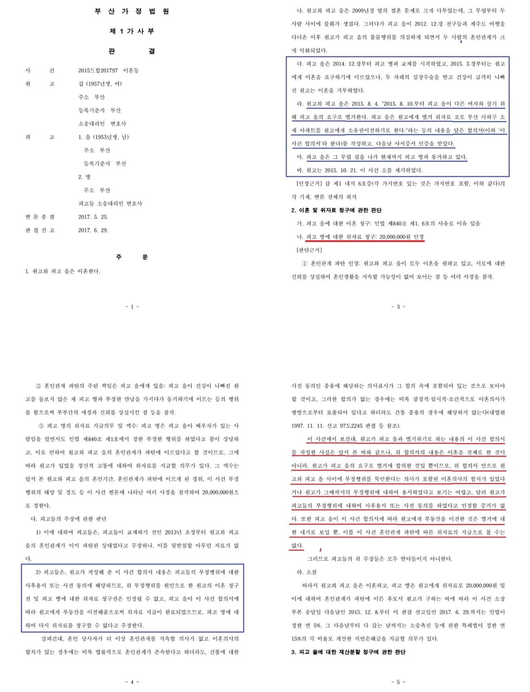 - 별거 합의 후 부정한 행위에 대한 책임을 인정한 하급심 사건 : 부산가정법원 2017. 6. 29. 선고 2015드합201797 판결