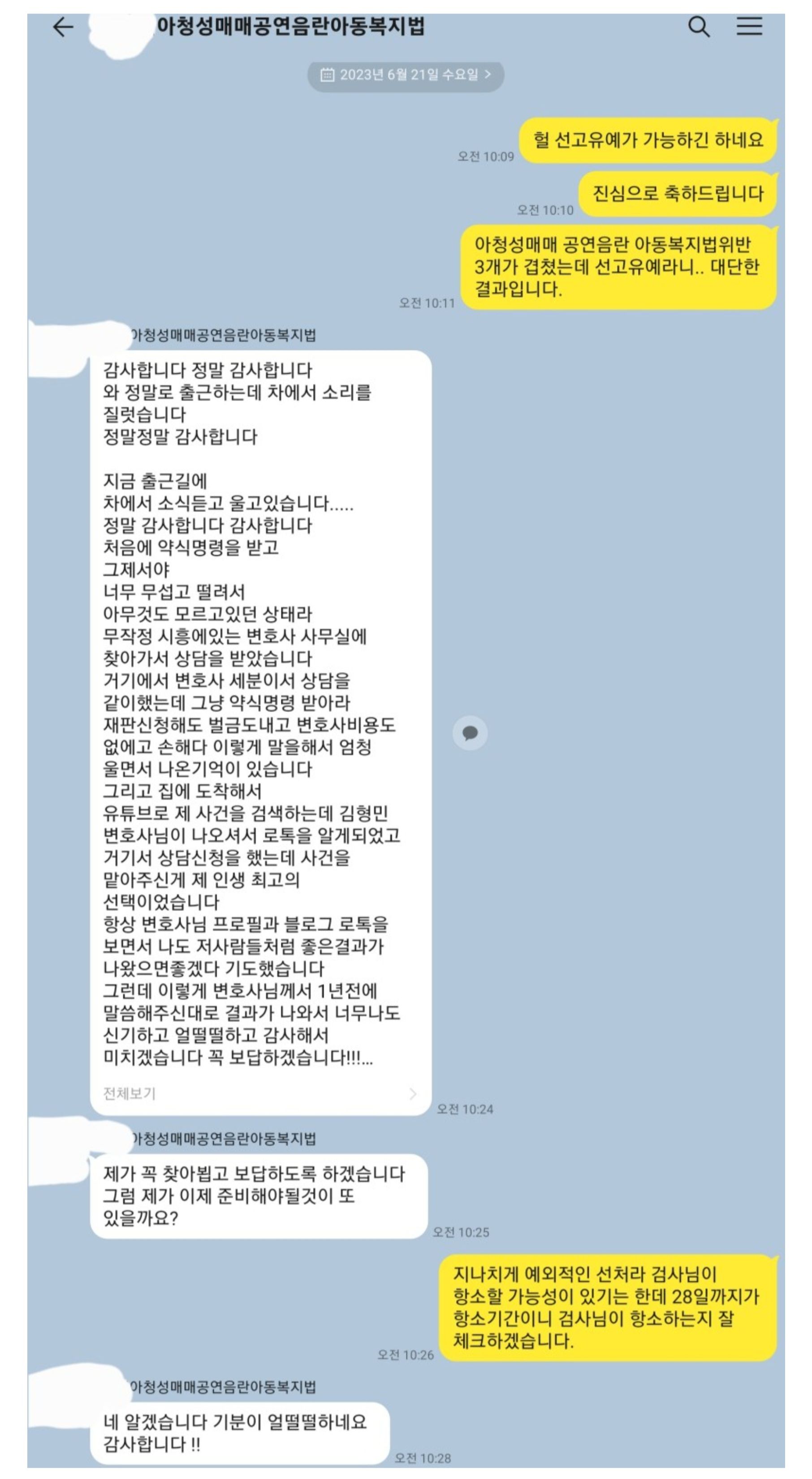 위 죄명 이외에 폭행도 있었으나 폭행은 합의가 되었고 반의사불벌죄이기 때문에 공소기각판결 대상이어서 언급하지 않았습니다. 아청법위반(성매수등) 아청성매매의 대상은 13세였으며 아동복지법위반(아동에 대한 성희롱)의 대상은 14세였습니다. 의뢰인은 다수의 변호사 상담을 거쳐 제 사무실에 오게 되었는데 기록을 검토해보니 선고유예가 가능한 틈이 보였기 때문에 이에 대하여 설명을 하고 수임하여 변호를 시작하였습니다. 위 재판은 두 건의 수사단계의 사건이 병합된 사안이었는데 두 건 모두 변호사가 있었음에도 불구하고 제가 교체되어 변호를 진행하게 되었는데 저에게는 일상다반사입니다. 유명 카페 선임하였다가 저에게 온 사건들도 다수 변호하였고 이전 변호해 둔 것이 좀 심하다고 생각된 적도 다수 있었습니다.
