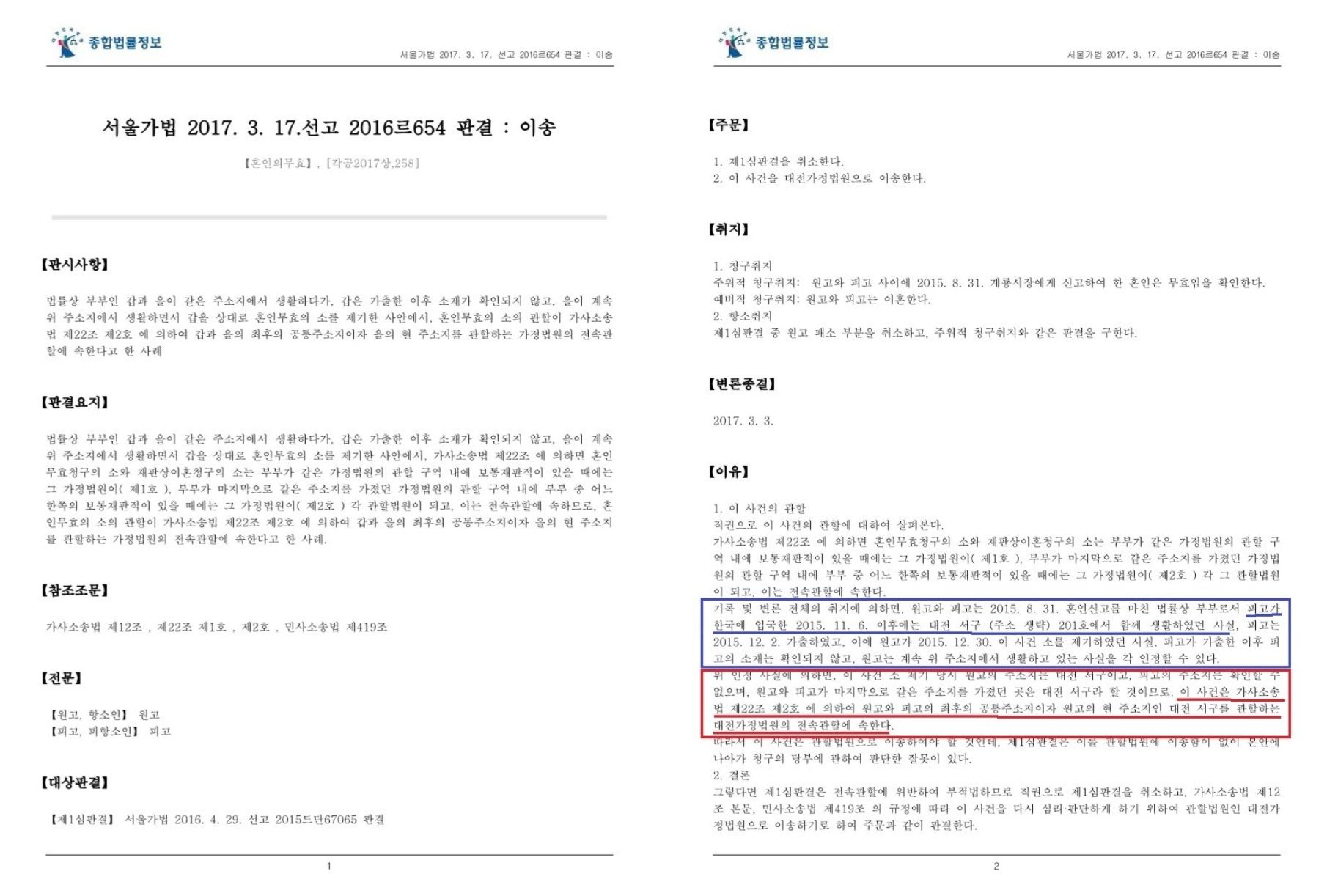 “법률상 부부인 갑과 을이 같은 주소지에서 생활하다가, 갑은 가출한 이후 소재가 확인되지 않고, 을이 계속 위 주소지에서 생활하면서 갑을 상대로 혼인무효의 소를 제기한 사안에서, 가사소송법 제22조에 의하면 혼인무효청구의 소와 재판상이혼청구의 소는 부부가 같은 가정법원의 관할 구역 내에 보통재판적이 있을 때에는 그 가정법원이(제1호), 부부가 마지막으로 같은 주소지를 가졌던 가정법원의 관할 구역 내에 부부 중 어느 한쪽의 보통재판적이 있을 때에는 그 가정법원이(제2호) 각 관할법원이 되고, 이는 전속관할에 속하므로, 혼인무효의 소의 관할이 가사소송법 제22조 제2호에 의하여 갑과 을의 최후의 공통주소지이자 을의 현 주소지를 관할하는 가정법원의 전속관할에 속한다.”라고 판시하였습니다(서울가정법원 2017. 3. 17. 선고 2016르654 판결).