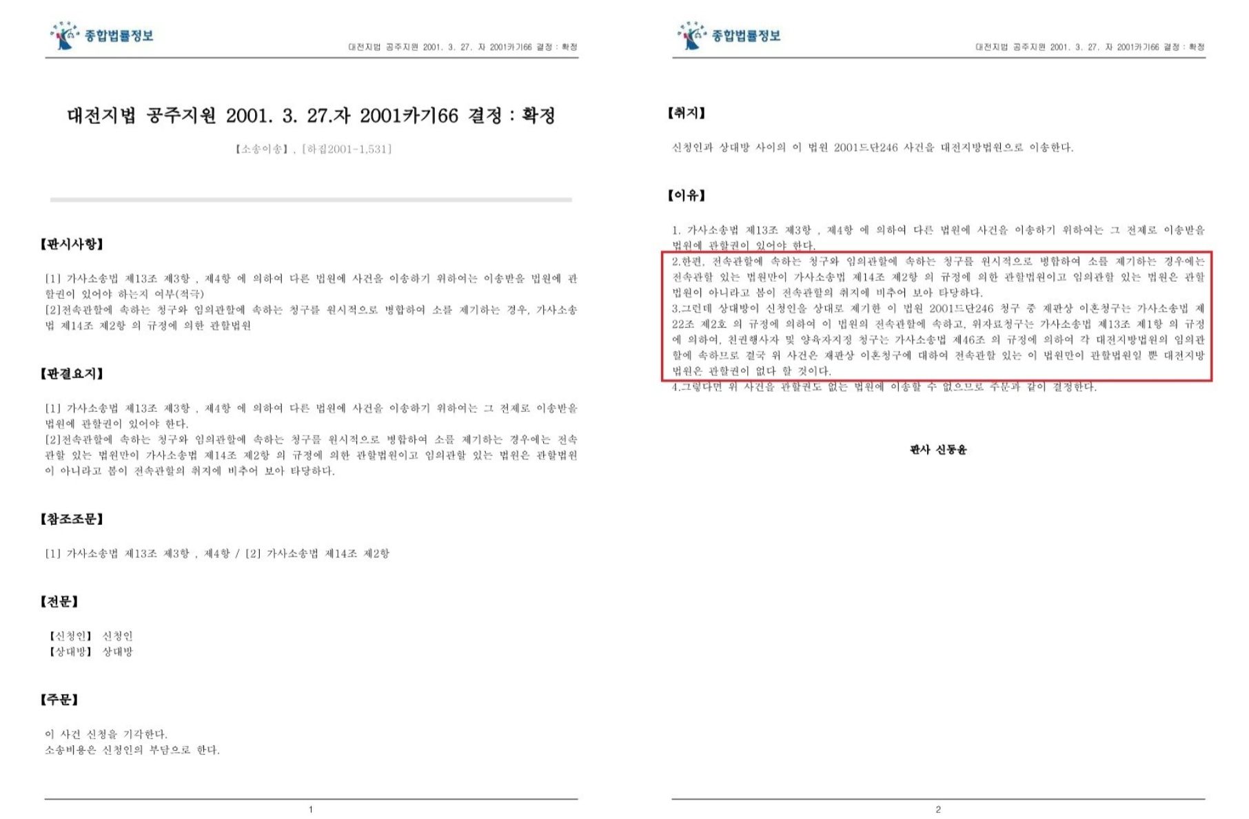 이러한 사례와 관련하여 대전지방법원공주지원 판결에서는 “상대방이 신청인을 상대로 제기한 이 법원 2001드단246 청구 중 재판상 이혼청구는 가사소송법 제22조 제2호의 규정에 의하여 이 법원의 전속관할에 속하고, 위자료청구는 가사소송법 제13조 제1항의 규정에 의하여, 친권행사자 및 양육자지정 청구는 가사소송법 제46조의 규정에 의하여 각 대전지방법원의 임의관할에 속하므로 결국 위 사건은 재판상 이혼청구에 대하여 전속관할 있는 이 법원만이 관할법원일 뿐 대전지방법원은 관할권이 없다 할 것이다. 그렇다면 위 사건을 관할권도 없는 법원에 이송할 수 없으므로 주문과 같이 결정한다.”라고 판시한 것입니다(대전지방법원공주지원 2001. 3. 27.자 2001카기66 결정).