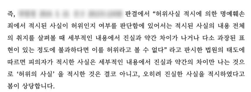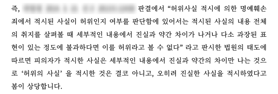 저희가 주장해야 했던 내용 중 가장 중요한 부분은 바로 의뢰인분께서 작성한 내용이 진실한 사실이라는 점이었는데요.