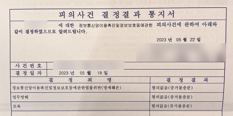 3. 최종 결과 - 리뷰 명예훼손 무혐의
