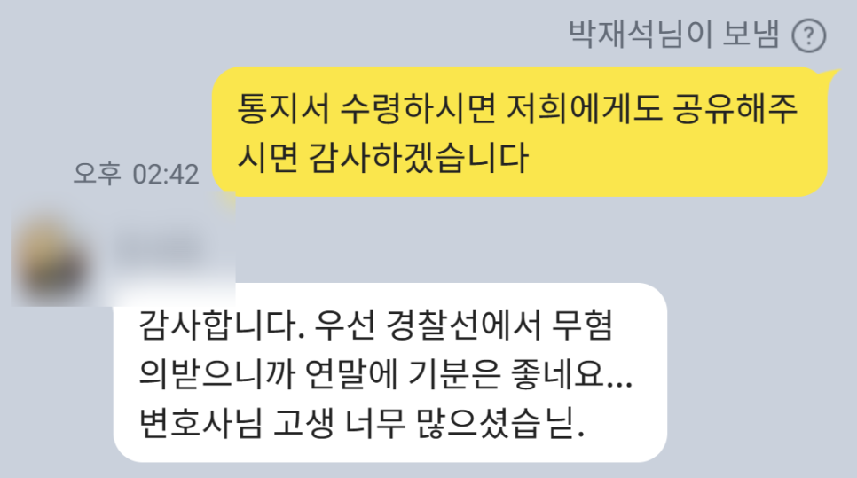이후, 상대방은 이의신청을 하였지만, 저희가 제출한 의견서를 보시고 검찰에서도 역시 바로 '혐의없음' 처분을 내렸습니다. 이렇게 깔끔하게 사건이 잘 해결되어 의뢰인분은 너무나도 만족해하시며 여러 차례 감사하다는 말씀을 전해주셨습니다.