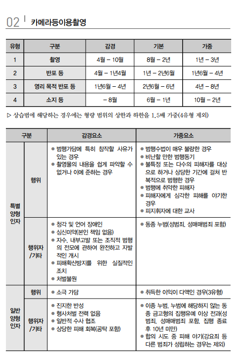 카메라등이용촬영죄는 사람의 내밀한 영역을 침해하고 자칫 인터넷을 통해 유포 되었을 경우 회복할 수 없는 피해가 발생할 가능성이 높기 때문에 기본적으로 법정형이 쎈 편입니다.