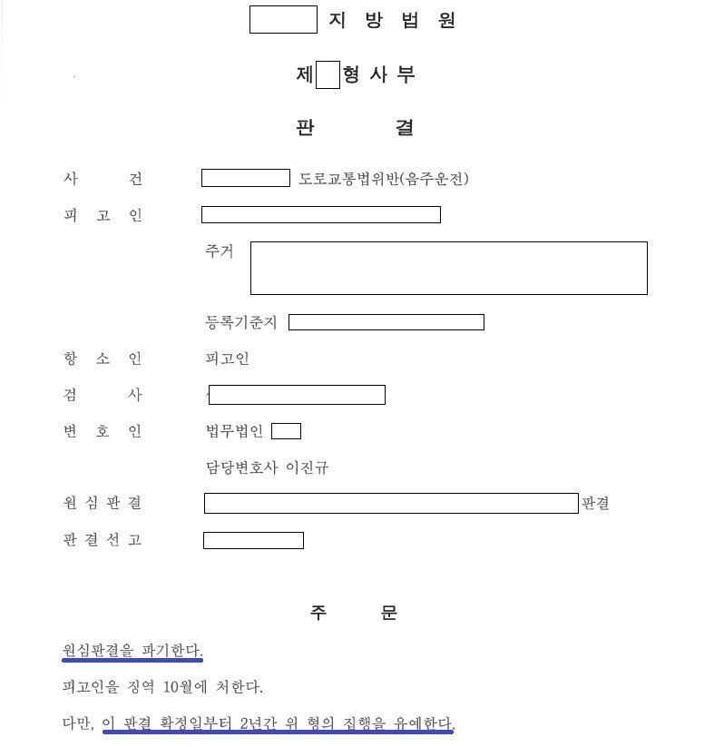 도로교통법위반(음주운전) 4회로 1심에서 징역10월의 형을 선고 받았으나 항소심에서 집행유예로 감형을 받은 사례입니다.