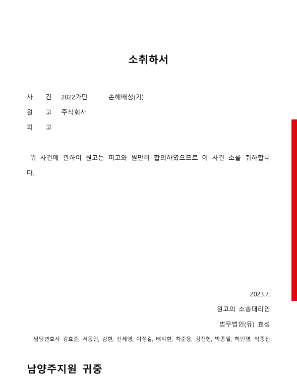 저는 즉각 민사소송 손배청구를 하면서 서약의 존재, 위약금의 액수, 유출행위 등을 구체적으로 주장 입증하였고 소장을 받은 피고는 의뢰인에게 연락하여 손해배상액을 지급할테니 소를 취하해달라고 요청하여 의뢰인은 손해배상액을 받고 소를 취하하였습니다.