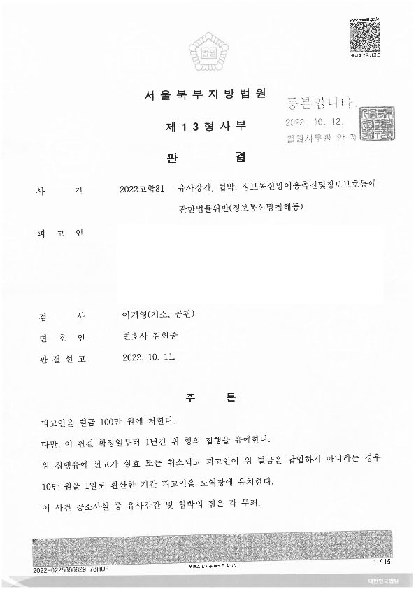 결국 정보통신망법위반에 대하여는 벌금 100만원을 선고 받게 되었고, (이 부분 집행유예이므로 실질적으로 벌금을 납부하지 않아도 됨)