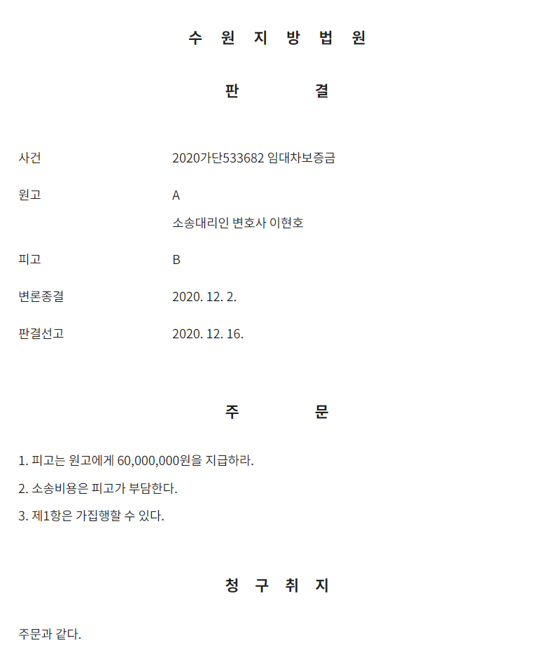 임대차보증금 6천 만원에 대해 전부 승소 하였습니다.