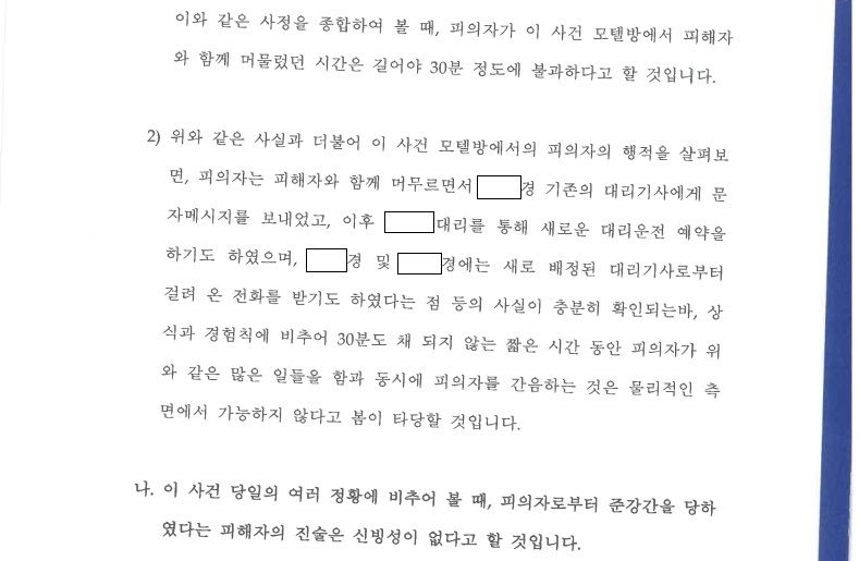 이 사건 당시 의뢰인분께서 상대방 여성을 모텔방에 데려다 준 뒤 그 방에서 대리운전 예약 등을 하기 위해 약 20분 내지 30분 가량 방에 머물렀던 사정이 확인되었기 때문에, 이 사건 전후의 정황 등을 바탕으로 의뢰인분이 모텔방에 머물렀던 시간 동안 아무런 일도 없었다라는 점을 적극적으로 주장해야 하는 사건이었습니다.