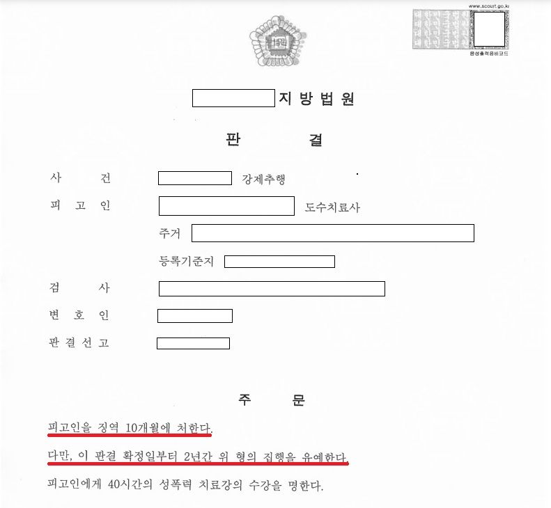- 가해자는 이 사건 공판과정에서도 완강하게 혐의를 부인하였으나 재판부는 '피고인이 도수치료를 하던 중 피해자(의뢰인)을 강제로 추행한 사실을 인정할 수 있다'는 판단을 하였고, 가해자에게 집행유예를 선고하였습니다.