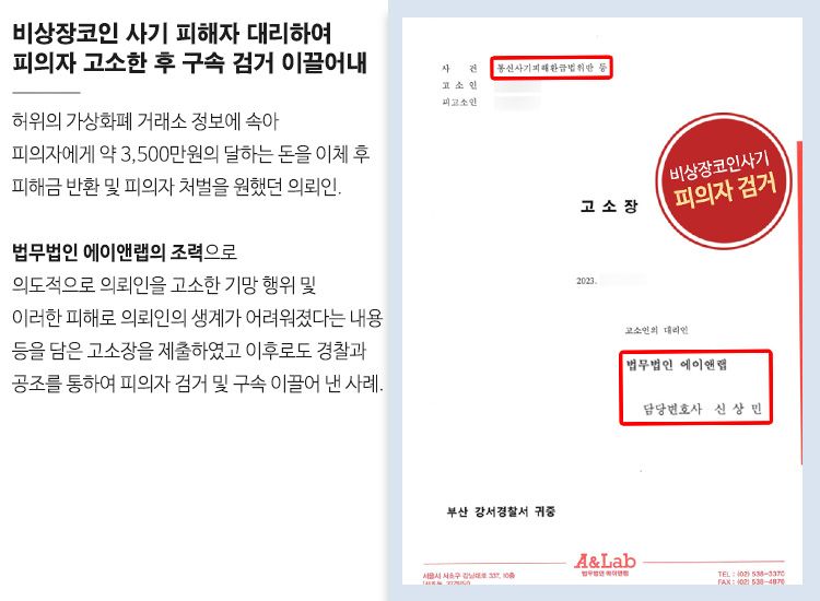 이후 속았다는 것을 깨달은 의뢰인은 피해금을 돌려받고자 하였으나 피의자의 대포폰 사용 및 타인 명의 통장 사용으로 상황이 어렵다는 것을 깨닫자 신속히 피의자 처벌을 위해 법무법인 에이앤랩을 찾아오셨습니다.