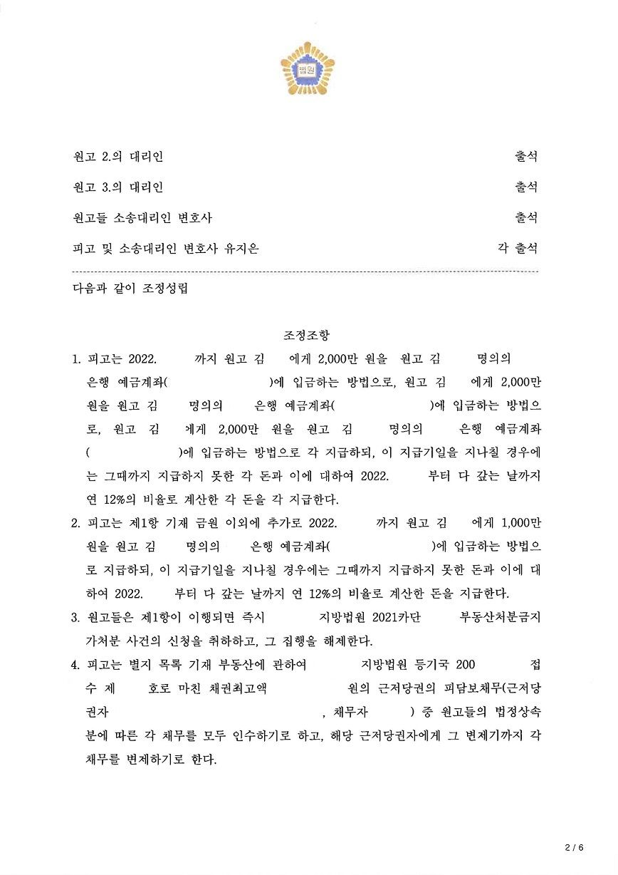 결국, 일정액의 유류분은 줄 수밖에 없는 상황이었지만 1인당 2천만 원으로 방어하며 원만하게 조정이 성립되었고 의뢰인이 만족스럽게 마무리된 사안입니다.