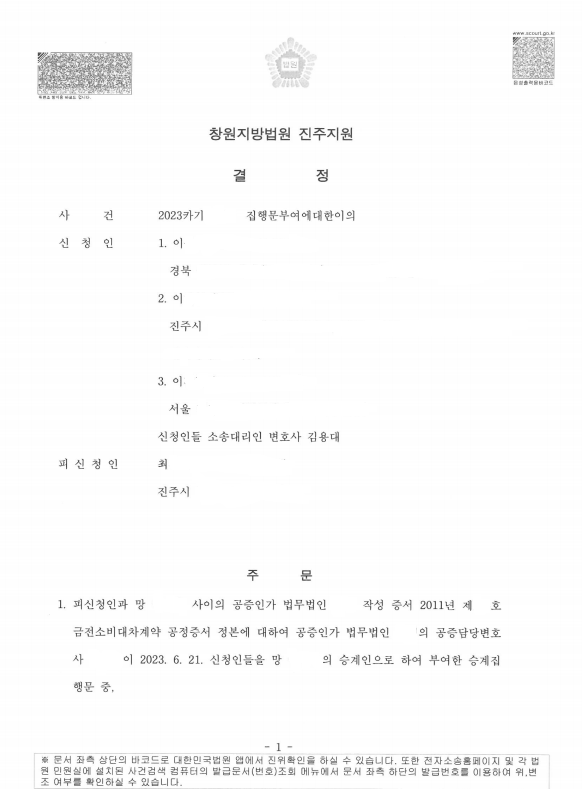 이에 진주지원은 본 법률사무소가 강제집행 정지신청서를 제출한 다음날 바로 승계집행문 부여에 대한 이의신청에 대하여 결정을 내려줌으로서 그 즉시 강제집행을 막을 수가 있었습니다.
