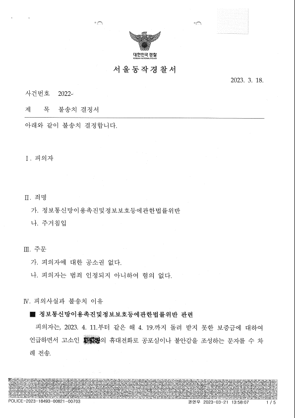 이야기나 하자며 문고리를 잡아 당긴 것은 주거침입의 고의가 없는 행위라는 이유로 적극 무혐의주장을 펼치게 되었고 경찰단계에서 불송치로 사건을 잘 마무리할 수 있었습니다.