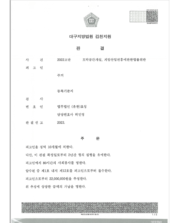 저는 경찰 조사부터 동석하여 사건의 경위, 도박장 운영기간, 수익금 등을 중점적으로 주장 입증하였고 법원은 집행유예를 선고하였습니다.