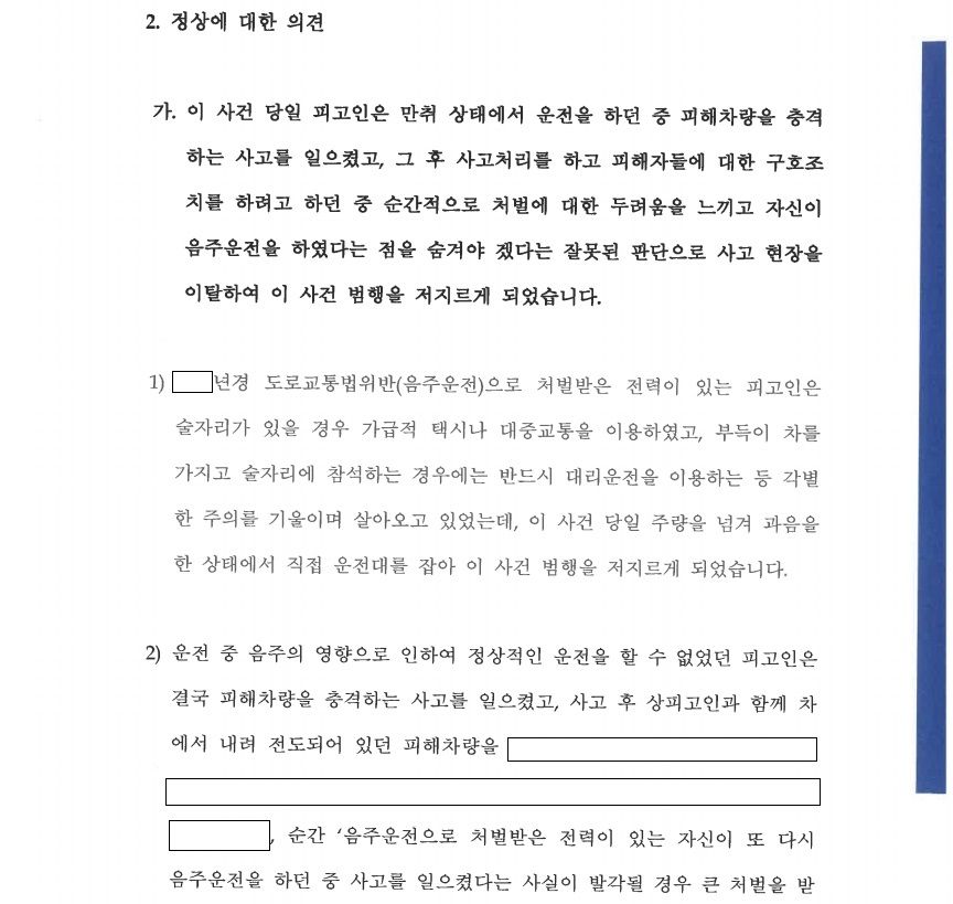 - 명시적인 피해자가 존재하는 사건이었기 때문에 저는 피해자분들과의 원만한 합의를 위해 최선을 다하였고, 다행히 이 사건 첫 공판기일 전까지 피해자분들과 원만하게 합의할 수 있었습니다.