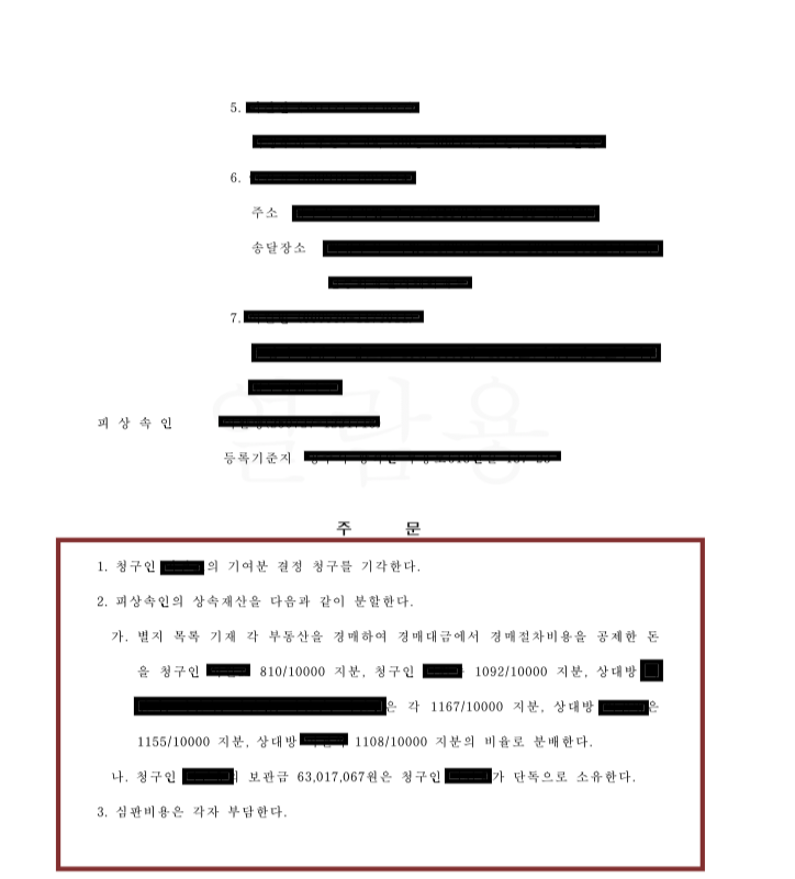 나. 본 사건의 경우 이런 상속재산분할심판 청구에 있어서 문제시 되는 모든 쟁점들에 대하여 변호사가 효과적으로 사건을 수행한 것으로 구체적인 상속분에 있어서 의뢰인의 이익을 반영한 심판문을 받아낼 수 있었다는 점에 의의가 존재합니다.