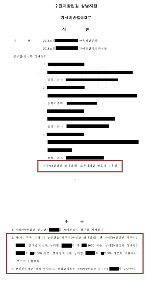 가. 재판부는 김홍일변호사의 주장을 받아들여, 상속재산에 대한 의뢰인의의 법정상속분을 인정하는 취지의 결정을 하였습니다.