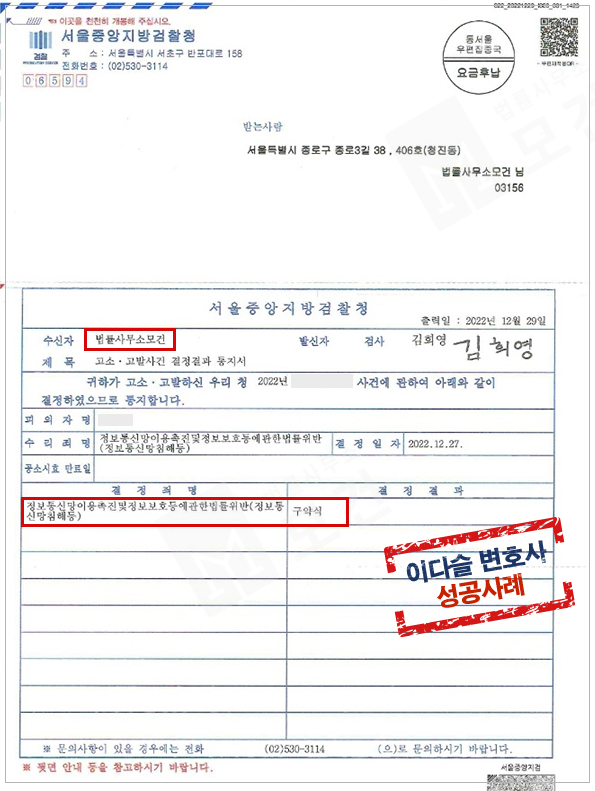 고소 대리, 정보통신망법위반 정보통신망침해 '구약식'