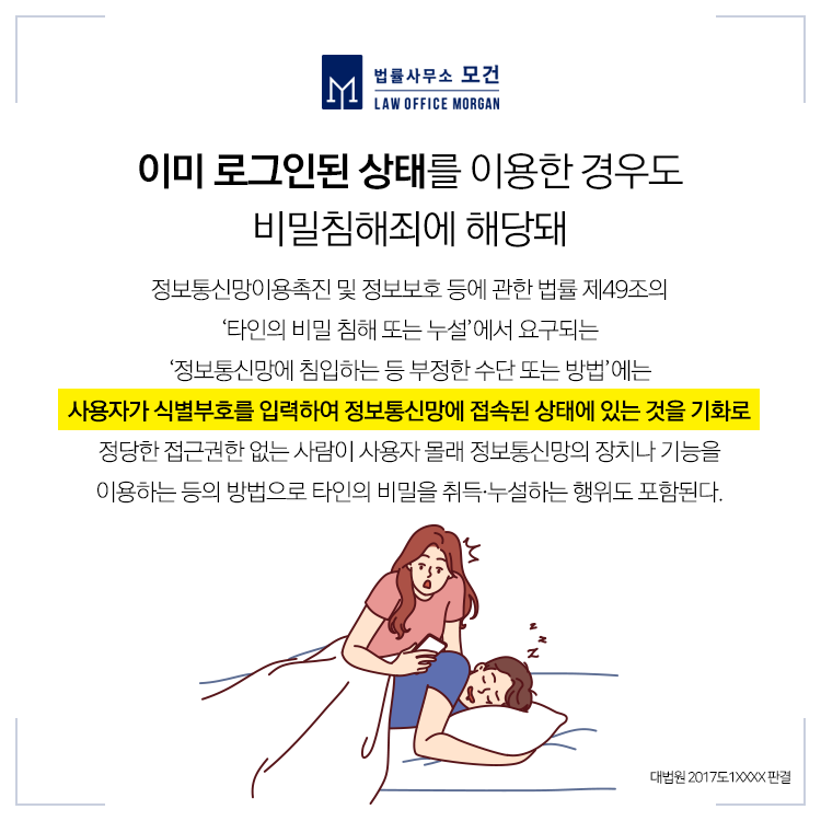 ✔ 비슷한 판례 : 피고인은 내연관계에 있던 피해자로부터 건네받은 휴대폰으로 피해자와 그의 아내 사이의 카카오톡 대화내용을 살펴보던 중, 피해자 몰래 카카오톡 '내보내기' 기능을 이용하여 카카오톡 대화내용 파일을 피고인의 메일로 전송하였다가 정보통신망법위반 정보통신망침해 혐의로 기소되었습니다.