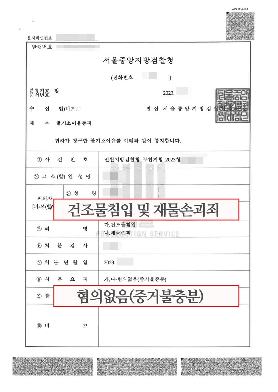 이러한 노력의 결과, 경찰은 의뢰인에게 건조물침입 및 재물손괴 등의 혐의가 없다고 판단해 2가지 혐의 모두 혐의없음(증거불충분 판결)을 내렸습니다.