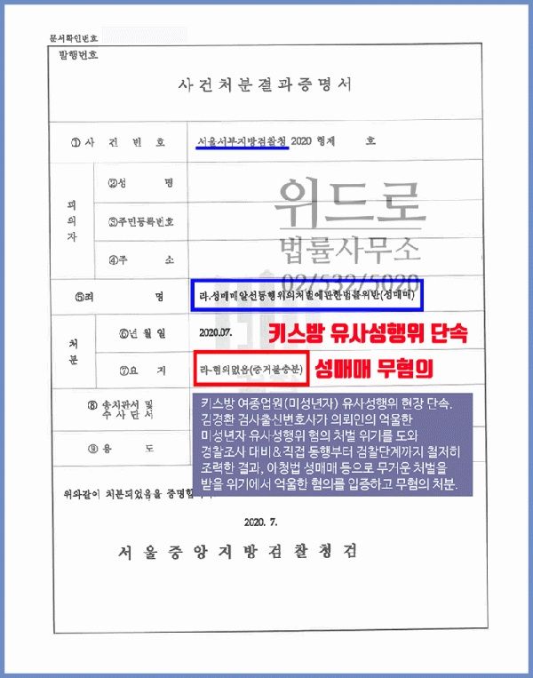 경찰이 현장에서 증거물을 확보하고 이후 경찰조사에서 미성년자 여종업 성매매처벌 관련 아청법으로도 집중 조사하고 추궁하자, 억울한 사실이 있었던 의뢰인이 김경환 성범죄전담 검사출신변호사를 찾아와 상담을 받고 유리한 진술대비 및 검찰단계에서 억울한 혐의를 중심으로 구체적인 사건설명의 변호인의견서 제출 등의 조력을 받은 결과,