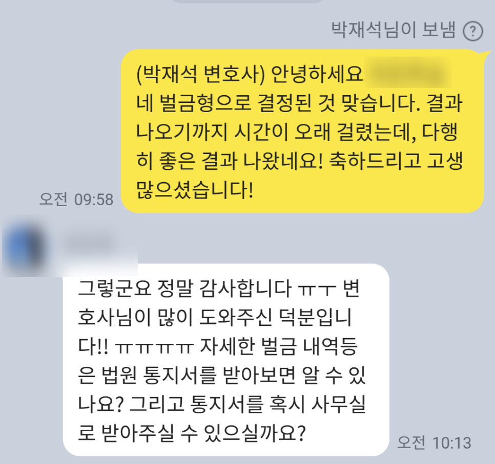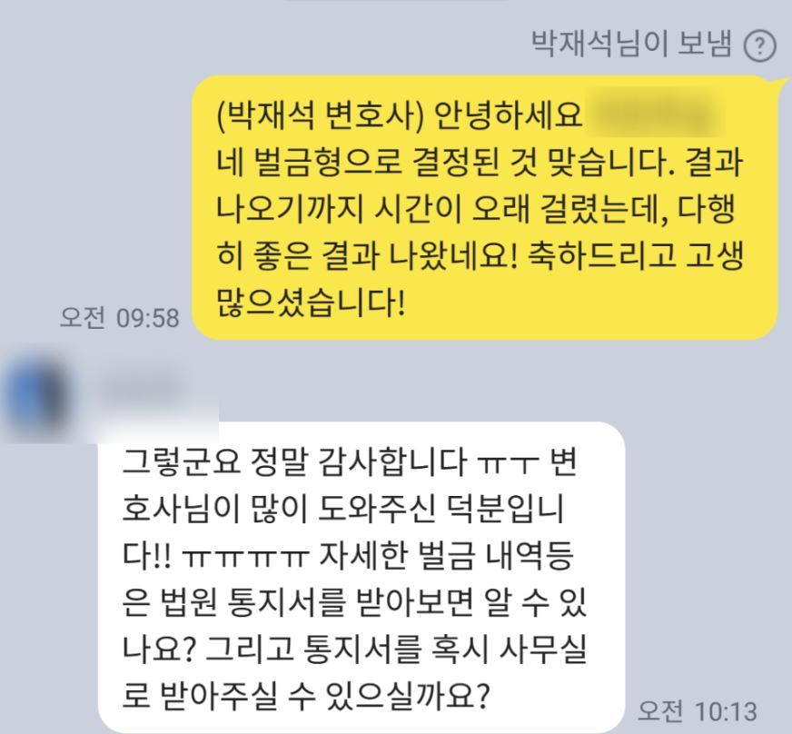 결국 검찰에서는 상대방에 구약식 처분을 내려 성공적으로 사건을 마무리지을 수 있었습니다! 의뢰인분도 원하는 결과를 받아보실 수 있어서 너무나도 행복해하셨습니다.