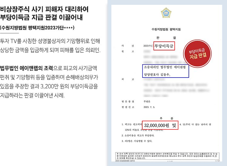 그 결과 수원지방법원 평택지원은 이러한 김동우 변호사의 주장을 인정하였고 피고는 원고에게 3,200만 원의 부당이득금을 지급하라는 판결을 내렸습니다.