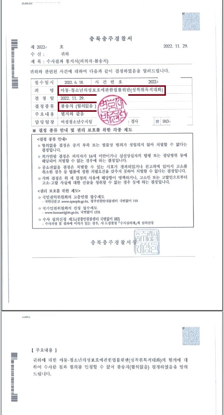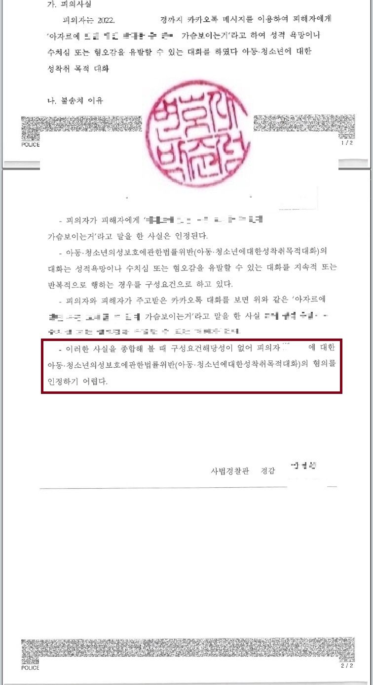 다만 어느 정도 성적인 대화가 있기는 하였기에 아청법 위반 사안으로 입건되어 조사를 받게 되었습니다.