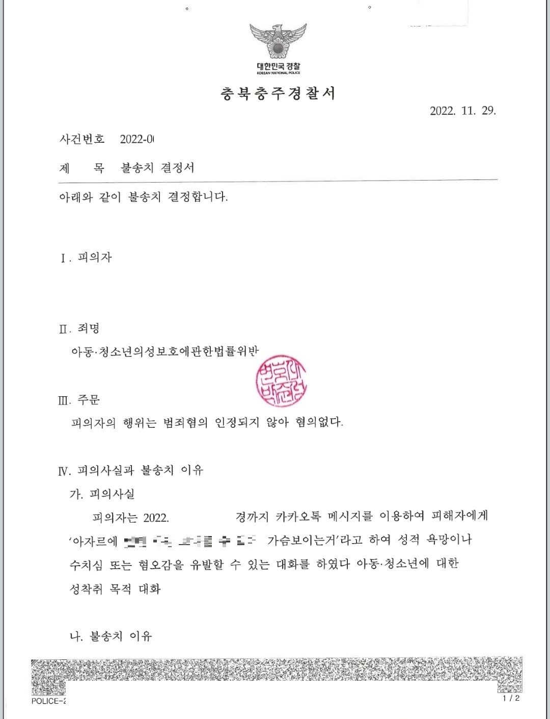 이번 포스팅은 아동·청소년의 성보호에 관한 법률 제15조의2제1항 (성착취목적대화) 불송치 (혐의없음) 사건 성공 사례입니다.