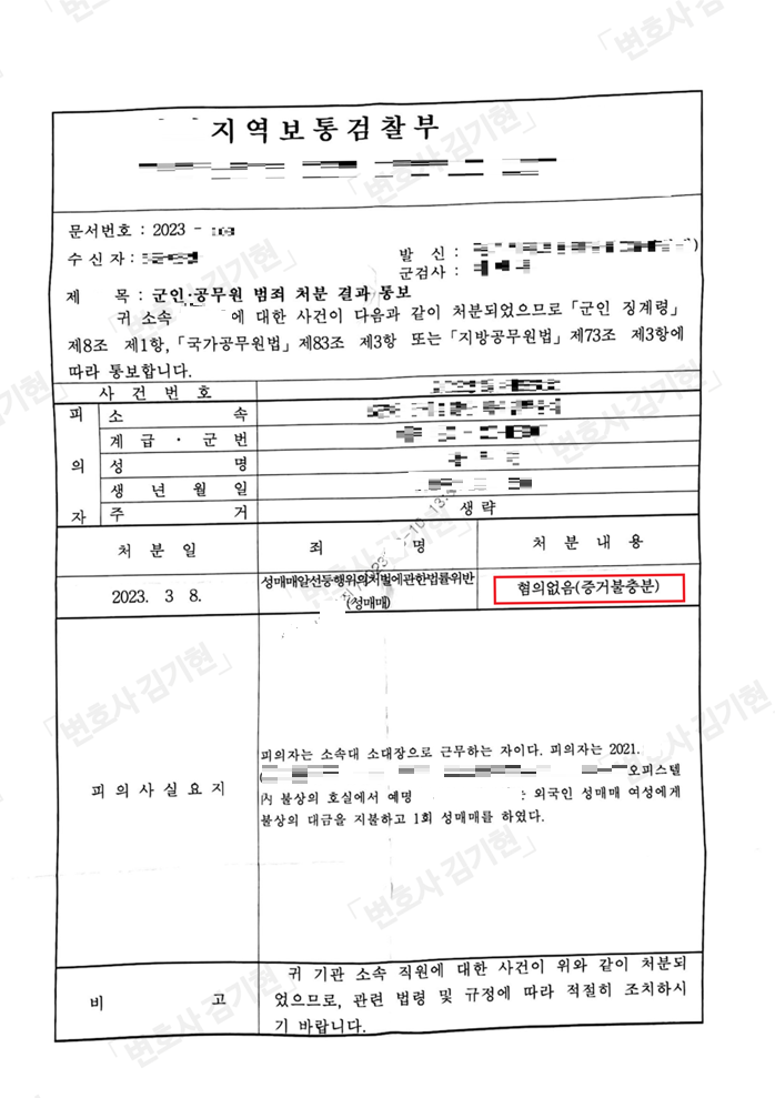 결국 수사기관에서는 의뢰인에 대하여 성매매 무혐의 판단을 결정하였고, 의뢰인은 현재까지 무탈하게 군생활 중입니다.