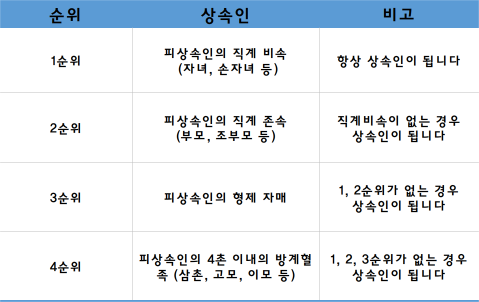 이거는 법에 그냥 딱 나와 있어요. 원래 직계비속인 자녀가 1순위예요. 그런데 자식이 없고 손자, 손녀도 없다면 2순위인 직계존속 부모님 아니면 조부모님으로 됩니다. 다 돌아가셨으면 3순위 형제, 자매 형제, 자매로 됩니다. 만약 외동이라면 4순위 사촌 이내의 방계 혈족 그러니까 삼촌, 고모 이런 분들에게 상속됩니다.