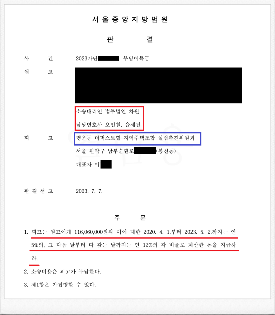 그러나, 가입 후 행운동 더퍼스트힐 지역주택조합 설립추진위원회의 사업에 진전이 없자, 의뢰인은 정식 민사소송을 통하여 조합과 체결한 계약을 취소한 후 기 납입한 금원의 반환을 원하셨습니다.