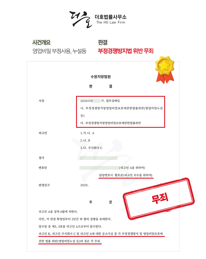 법원은 위 주장을 받아들여 피고인들에게 부정경쟁방지법 위반에 대해서 무죄를 선고, 피고인A에게만 업무상배임 혐의를 인정하며 집행유예를 선고하였습니다.