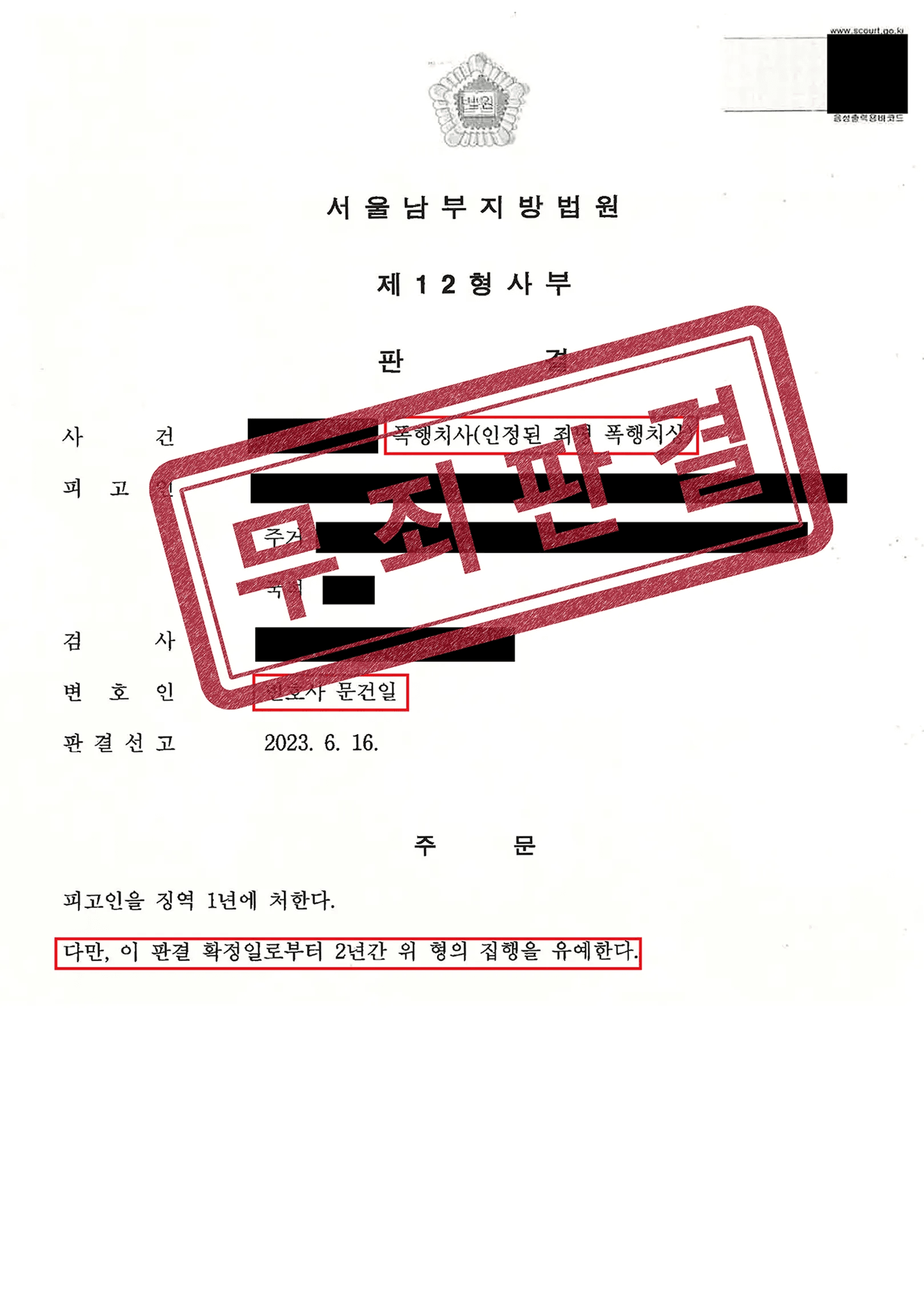 그에 따라 법원은 폭행치사에 대해 무죄를 선고하고, 축소사실로서 폭행치상을 인정하여 집행유예 판결을 받을 수 있었습니다.