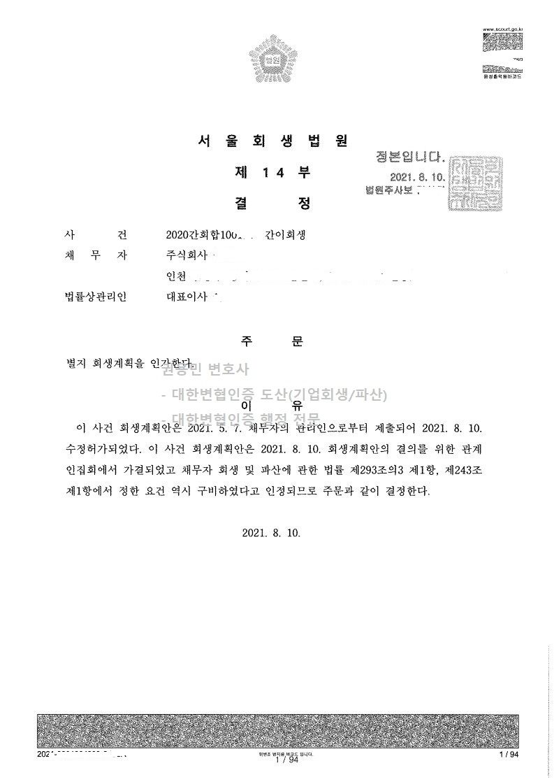2021. 08. 10. 서울회생법원 법인회생인가 사례입니다