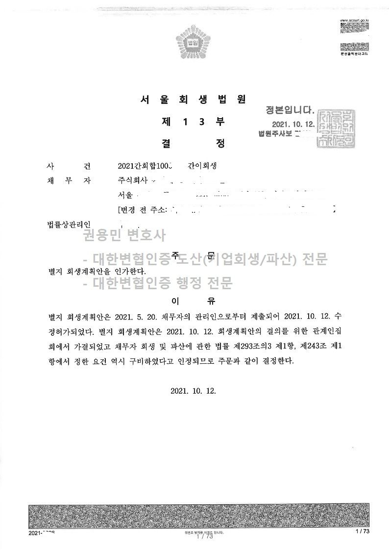 2021. 10. 12. 서울회생법원 법인회생인가 사례입니다