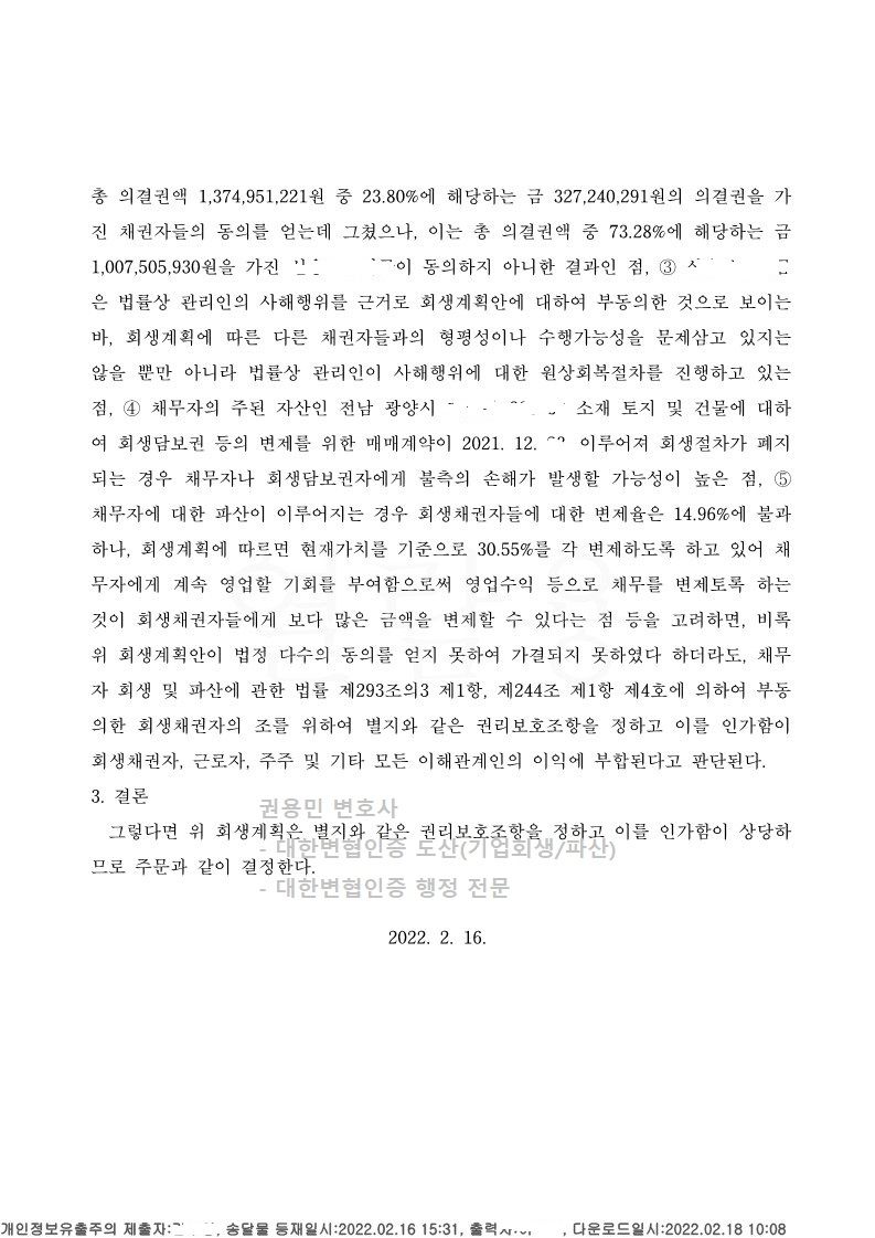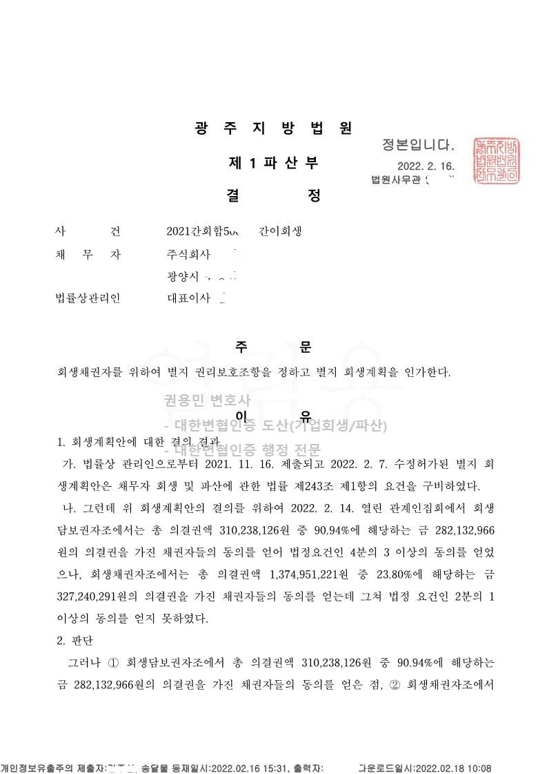 2022. 02. 16. 광주지방법원 법인회생강제인가 사례입니다