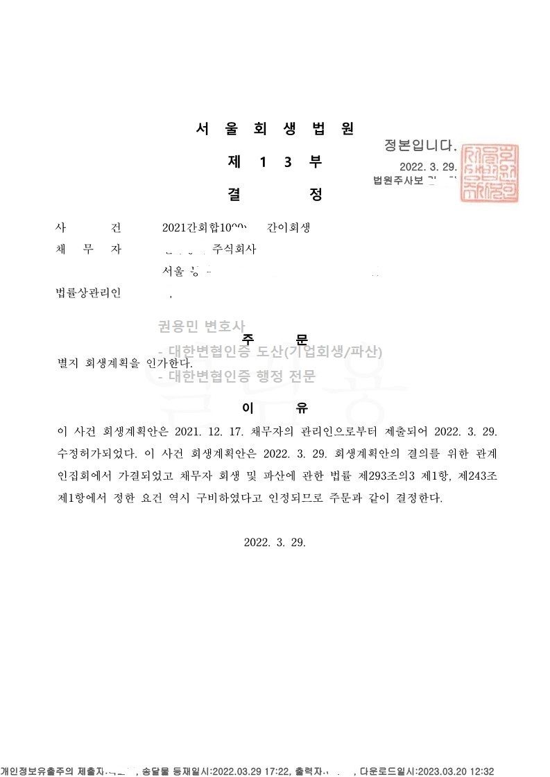 2022. 03. 29. 서울회생법원 법인회생인가 사례입니다