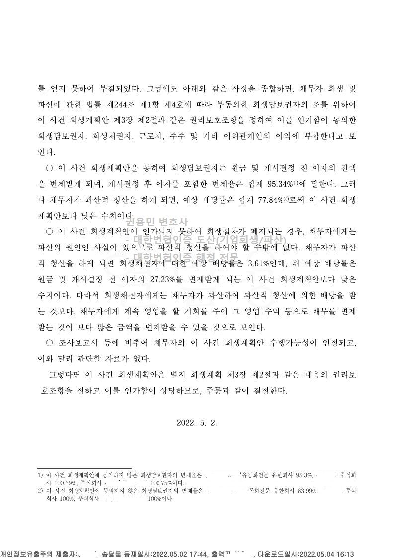 2022. 05. 02. 서울회생법원 법인회생강제인가 사례입니다