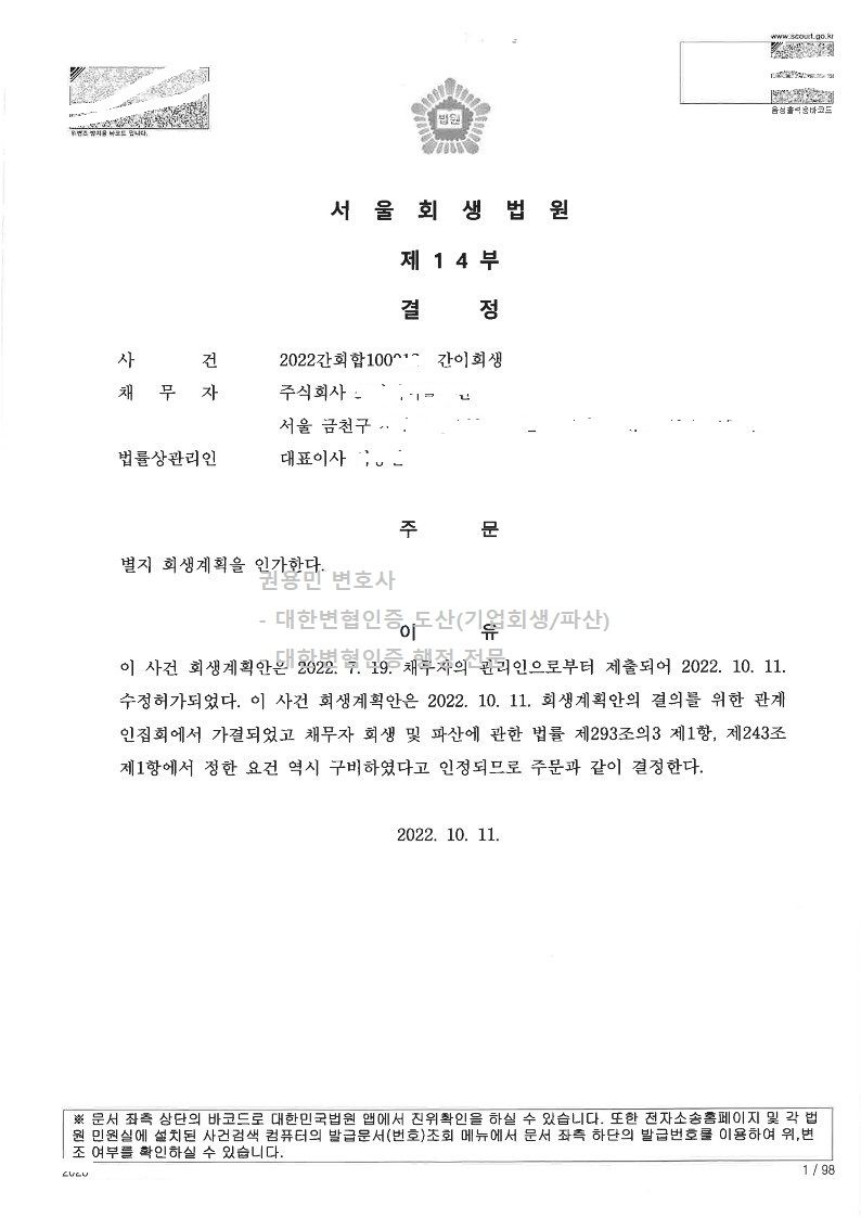 2022. 10. 11. 서울회생법원 법인회생인가 사례1입니다