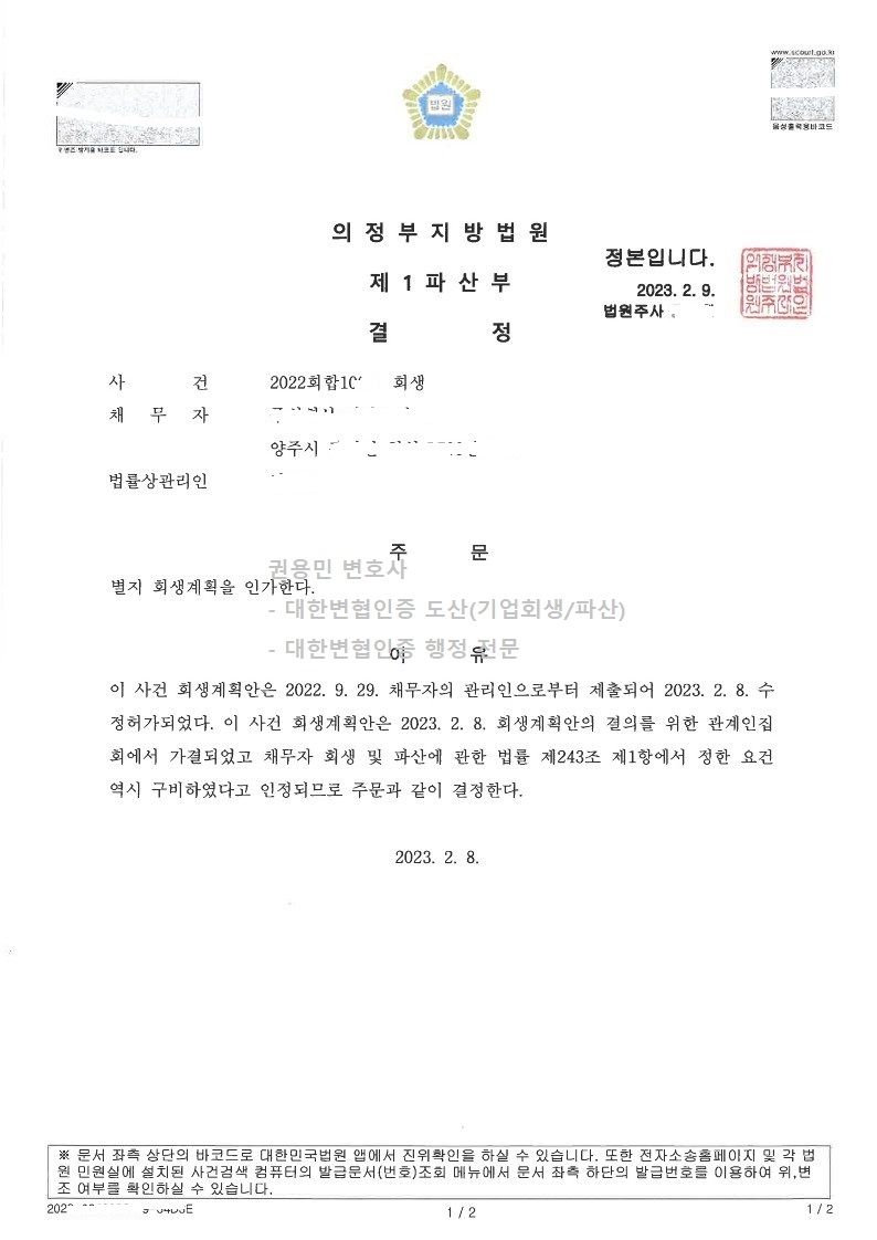 2023. 02. 08. 의정부지방법원 법인회생인가 사례입니다