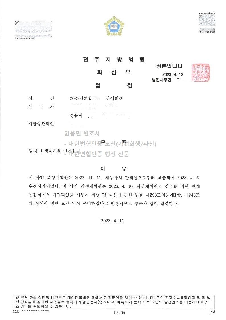 2023. 04. 11. 전주지방법원 법인회생인가 사례입니다