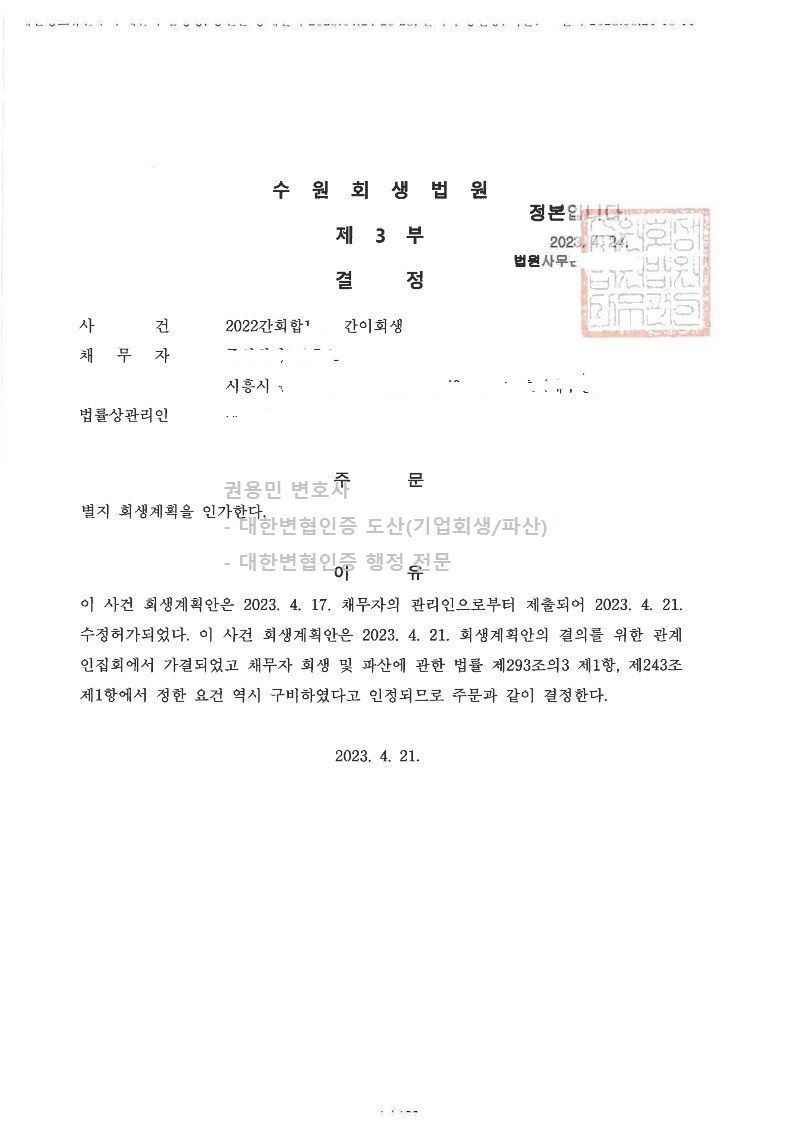2023. 04. 21. 수원회생법원 법인회생인가 사례입니다
