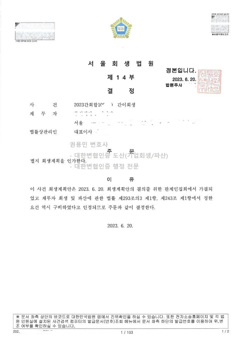 2023. 06. 20. 서울회생법원 법인회생인가 사례입니다