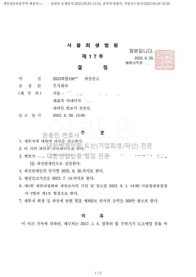2023. 06. 28. 서울회생법원 법인파산선고 사례입니다